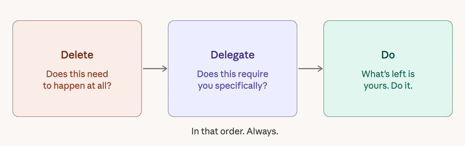 The third move — and only the third — is to do. What’s left after you’ve deleted what shouldn’t exist and delegated what doesn’t require you. That’s your job. That’s where your energy goes.